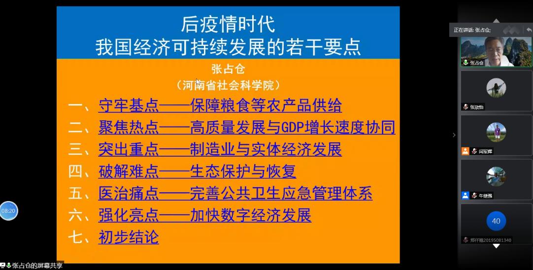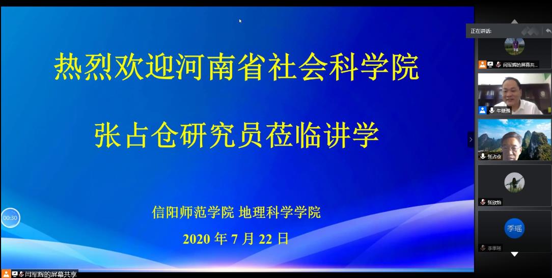 7月22日,应2026世界杯官网邀请,河南省社会科学院张占仓研究员通过腾讯会议平台为公司师生作了题为“后疫情时代我国经济可持续发展的若干要点”的学术报告。2026世界杯官网部分教师、研究生和本科生参加了报告会,报告会由副经理牛继强教授主持。