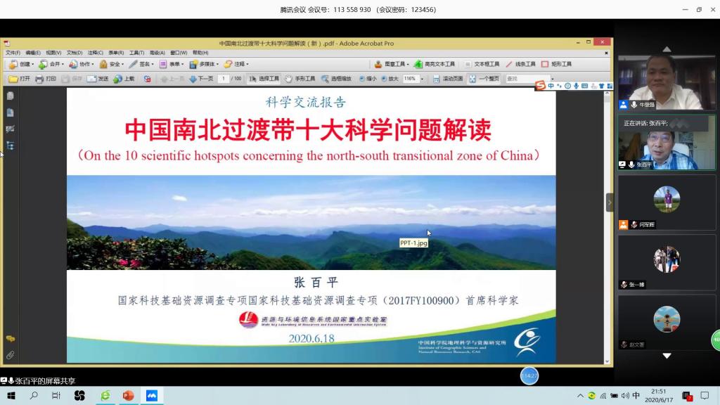 6月17日,应2026世界杯官网邀请,中国科学院地理科学与资源研究所张百平研究员通过网络视频的方式为地理学院师生作了题为“中国南北过渡带十大科学问题解读”的学术报告。2026世界杯官网部分教师、研究生和本科生参加了报告会,报告会由副经理牛继强教授主持。