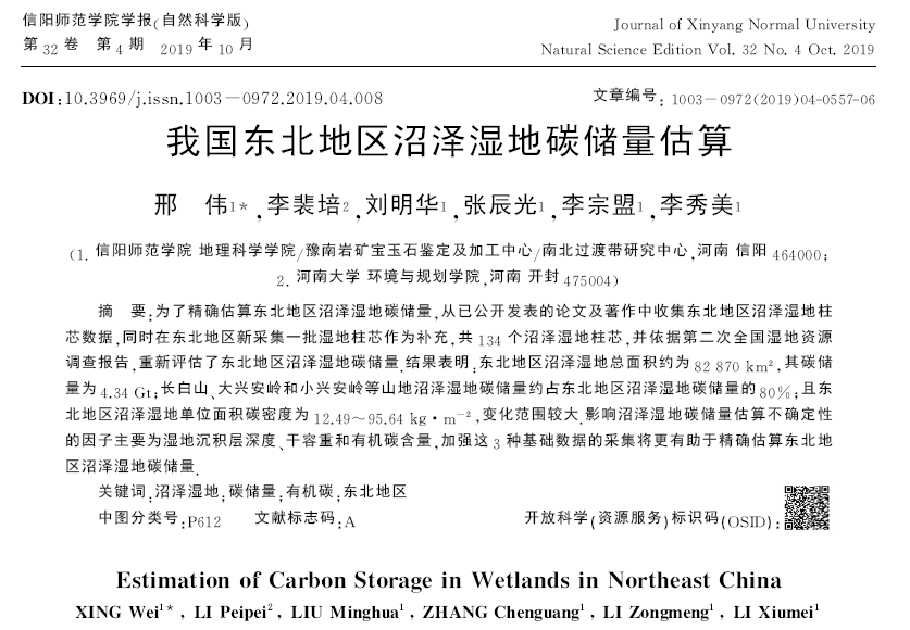 为了精确估算东北地区沼泽湿地碳储量,从已公开发表的论文及著作中收集东北地区沼泽湿地柱芯数据,同时在东北地区新采集一批湿地柱芯作为补充,共134个沼泽湿地柱芯,并依据第二次全国湿地资源调查报告,重新评估了东北地区沼泽湿地碳储量.结果表明:东北地区沼泽湿地总面积约为82 870km2,其碳储量为4.34Gt;长白山、大兴安岭和小兴安岭等山地沼泽湿地碳储量约占东北地区沼泽湿地碳储量的80%;且东北地区沼泽湿地单位面积碳密度为12.49~95.64kg·m-2,变化范围较大.影响沼泽湿地碳储量估算不确定性的因子主要为湿地沉积层深度、干容重和有机碳含量,加强这3种基础数据的采集将更有助于精确估算东北地区沼泽湿地碳储量.