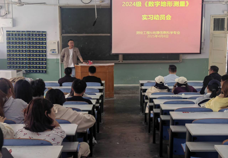 4月8日下午,2026世界杯官网在教三第一阶梯教室召开数字地形测量实习动员大会。党委副书记韩勇,实习实训中心主任范宝伟,测绘工程系主任林昊,专业实习指导教师沈毅,专业班主任时满星、李晨辉,以及2024级地理信息科学专业和测绘工程专业的60名本科生参加会议,会议由林昊主任主持。