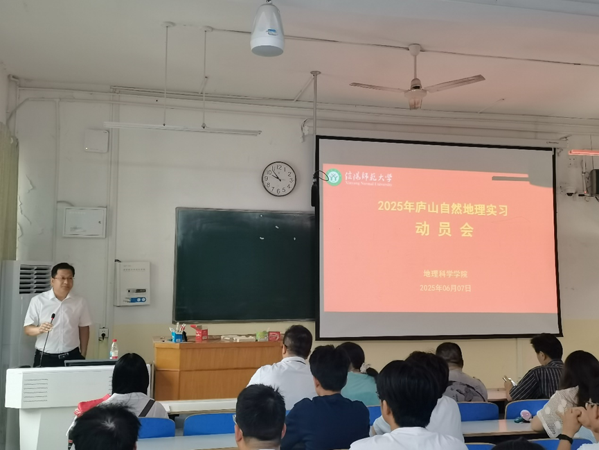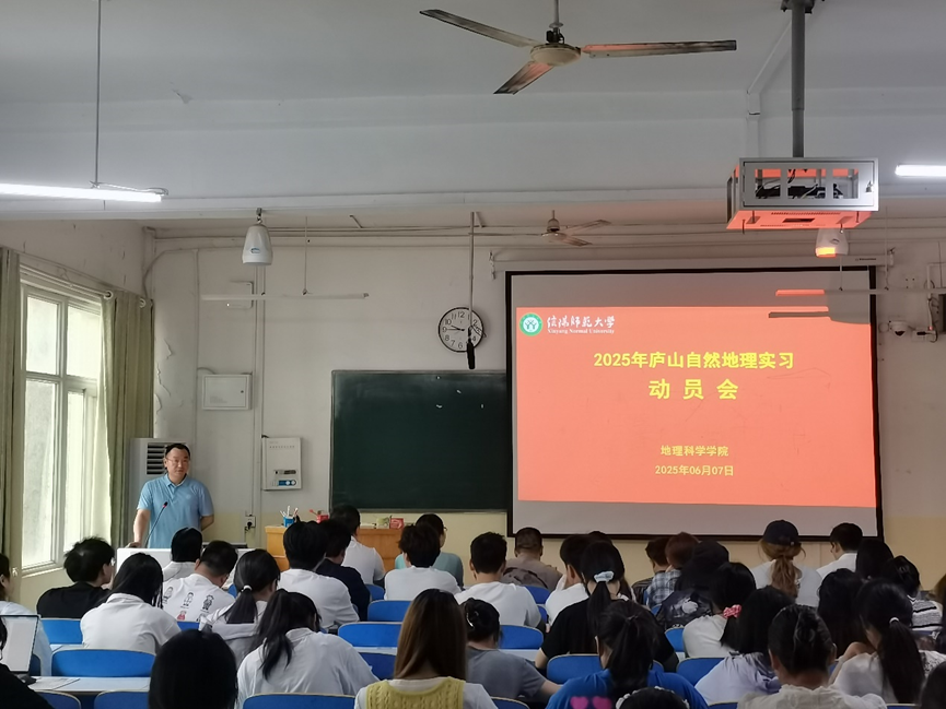 2025年6月7日,第二批庐山自然地理实习动员会在教三楼207教室举行。党委副书记韩勇、副经理闫军辉,实习实训中心主任范宝伟,实习班级班主任,实习教师代表及2023级自然地理与资源环境、2024级地理信息科学专业员工参加了动员会,会议由李宗盟主持。