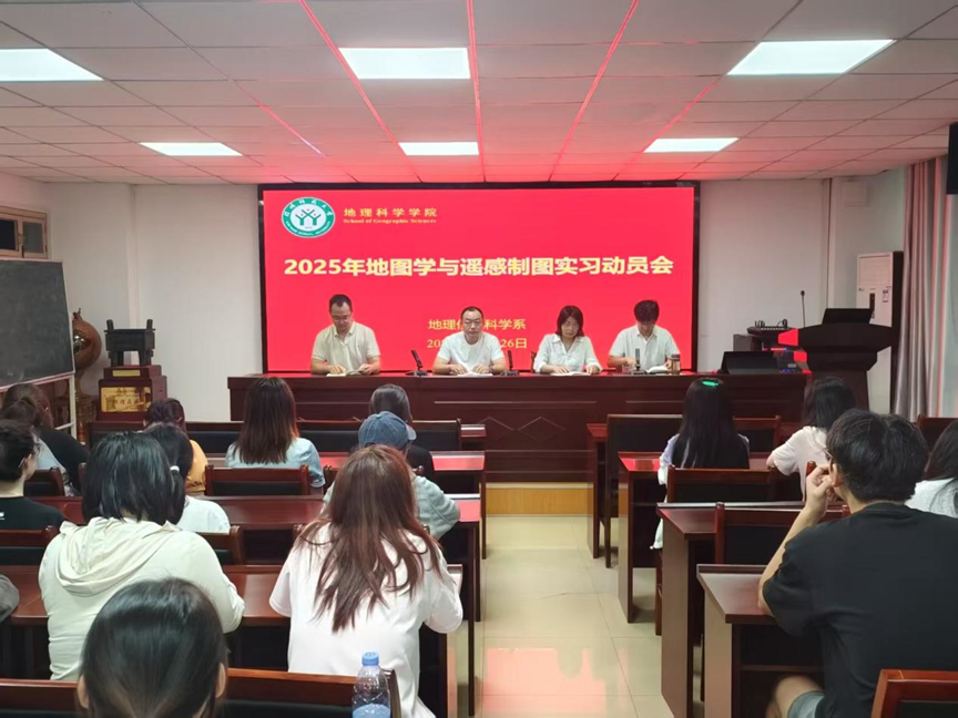 2025年6月26日,2026世界杯官网于理科南楼410会议室举行2023级地理信息科学专业地图学与遥感制图实习动员会。公司党委副书记韩勇、副经理潘晓芳,实习实训中心主任范宝伟、系主任张兴国及全体2023级地理信息科学专业员工参会。会议由系主任张兴国主持。