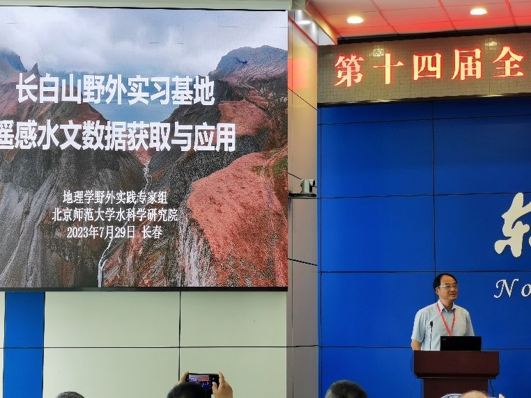 北京师范大学杨胜天教授做了题为“长白山野外实习基地遥感水文数据获取与应用”的报告,首先从以往高等教育中从“科研辐射教学”到“科研与教学相辅相成”理念的转变出发,以水量平衡方程为例,介绍了径流、蒸散发、降水量的数据获取方法,在此基础上研发了基于水面宽度与径流量的定量关系利用遥感技术在大尺度上快速观测径流量的方法,并分析了长白山径流对全球变化的响应。