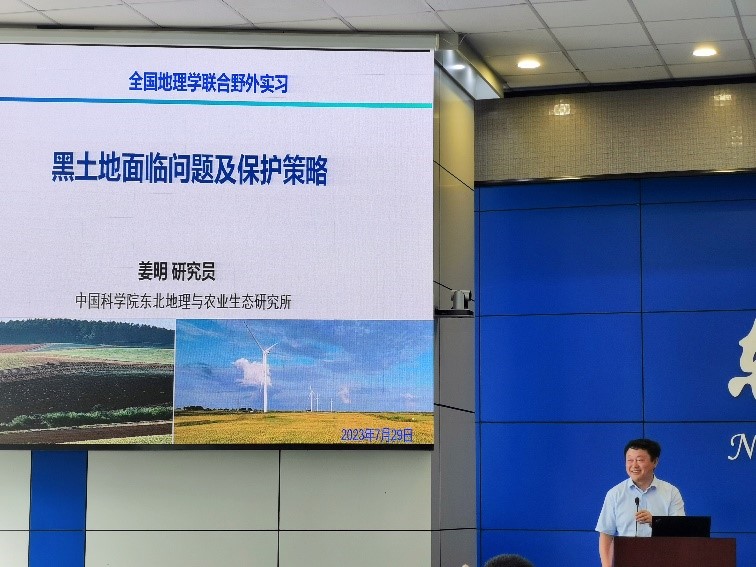 开幕式结束后,由全国老员工地理学野外联合实践教学高等联盟秘书长、华东师范大学周立旻教授主持学术报告。中国科学院东北地理与生态研究所所长姜明研究员作了题为“黑土地面临问题及保护策略”的报告,详细介绍了黑土、黑土地、黑土区的定义与内涵,接着从东北黑土垦殖历史过程出发,指出东北黑土目前面临的“薄、瘦、硬”的问题,介绍了团队的最新研究成果,主要包括初步构建天地空一体化监测、揭示了黑土地力下降的有关机理、发布《东北黑土地保护与利用报告》等,最后提出了“地理学要支持农业发展”的观点。