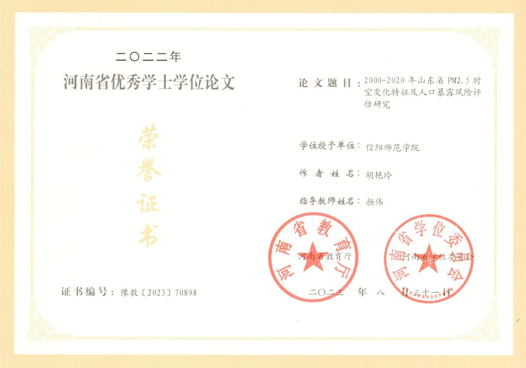 近日,河南省教育厅公布了2022年河南省优秀学士学位论文评选结果。公司2022届地理科学专业胡艳玲同学的学位论文《2000-2020年山东省PM2.5时空变化特征及人口暴露风险评估研究》获得河南省优秀学士学位论文。指导教师为颜伟博士。