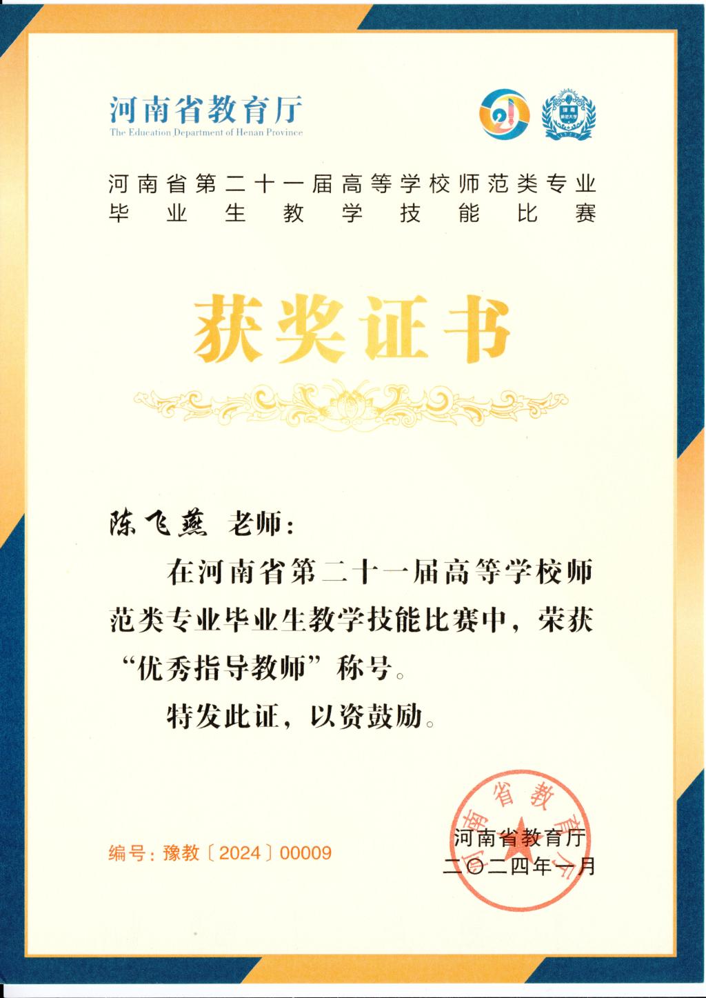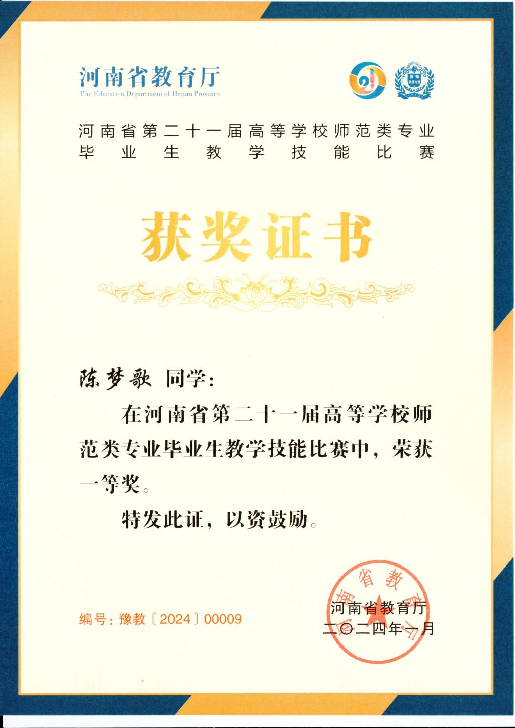 近日,河南省第二十一届高等学校师范类专业毕业生教学技能大赛在河南师范大学举办。公司2020级地理科学专业员工陈梦歌荣获一等奖,指导老师陈飞燕荣获优秀辅导奖。