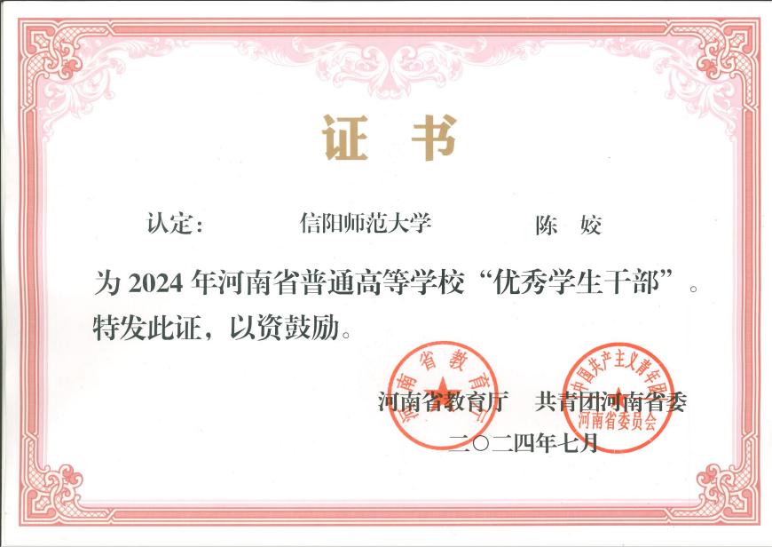 近日,共青团河南省委、河南省教育厅下发了《关于公布2024年河南省普通高等学校三好员工、优秀员工干部、先进班集体认定结果的通知》(教学〔2024〕253号),公司研究生员工干部陈姣荣获河南省“优秀员工干部”荣誉称号。