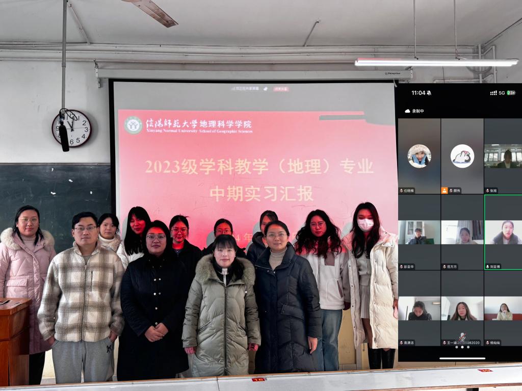 学科教学(地理)专业组汇报采取线上线下相结合的形式。各位研究生们分享了他们在课堂教学、班级管理、教育调研等方面的经历与感悟,展示了他们在教学方法探索、课堂互动创新、教研学习等方面的收获。员工汇报完成后,陈飞燕副教授作总结发言,提出了研读课标、深挖教材、回归课本等建议,并鼓励同学们将理论转化为实践,继续以认真严谨的态度参与实习,积累经验,提升自我。