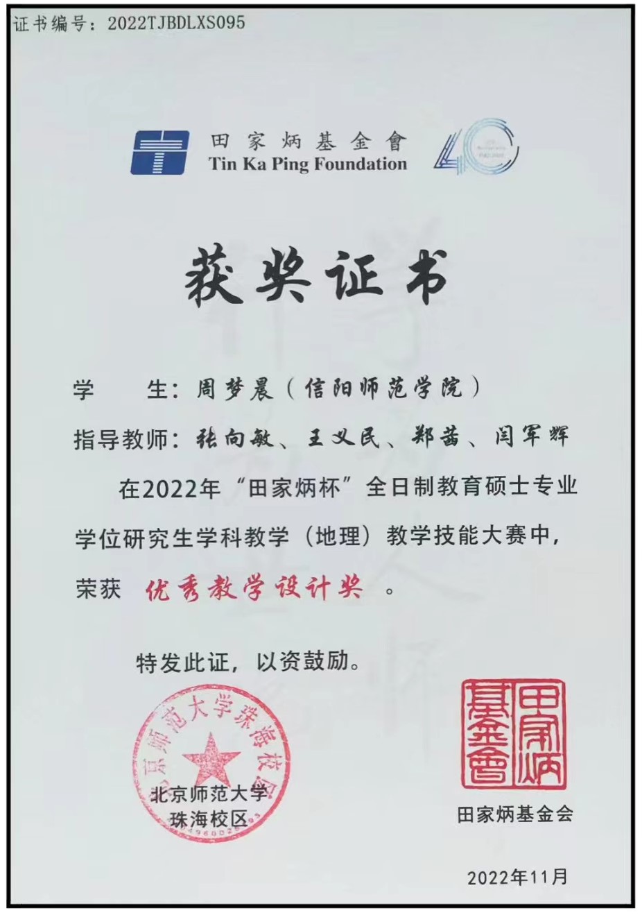 本次大赛由“田家炳杯”全日制教育硕士专业学位研究生教学技能大赛专家委员会、学科教学(地理)专家组组织,由北京师范大学主办、北京师范大学珠海校区承办,是高等教育质量监测国家数据平台认定的唯一一项国家级教育硕士教学技能竞赛。比赛4月初启动,分为初赛和决赛两个环节,初赛环节吸引了全国57所高校共207名选手参加。经过初赛评审,共有104位同学进入决赛。决赛采取腾讯会议平台进行,选手进行15分钟现场直播授课和5分钟专家提问。决赛中,周梦晨同学沉着镇定,凭借良好的素质和公司产品技能,出色完成现场授课和专家提问回答环节,喜获“优秀教学设计奖”。