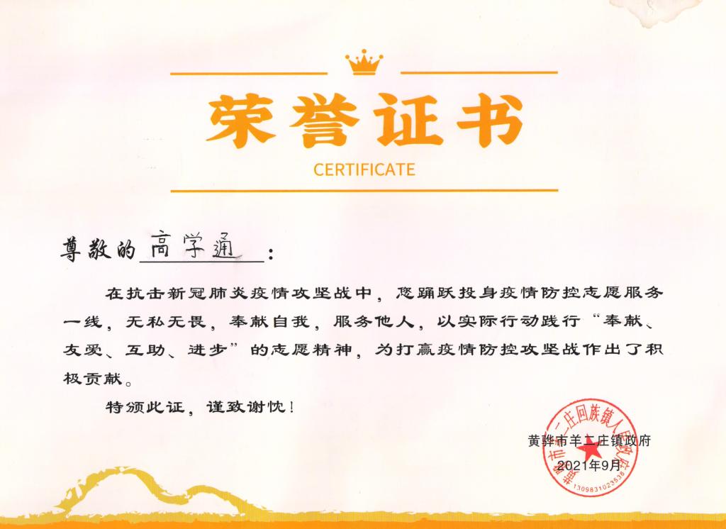 自8月12日起,高学通同学深入抗疫一线,大力弘扬“奉献、友爱、互助、进步”的志愿服务精神,在疫情防控卡点值班,风雨无阻,坚守岗位。仔细检查来往车辆与人员流动,为返乡人员登记、扫码、测温;汇报整理防疫物资,配合村委做好疫情防护宣传,守护人民群众身体健康,为疫情防控作出了重要贡献。羊二庄镇人民政府对在疫情防控工作中表现突出的高学通同学同学颁发荣誉证书,并向信阳师范学院发来表扬信。