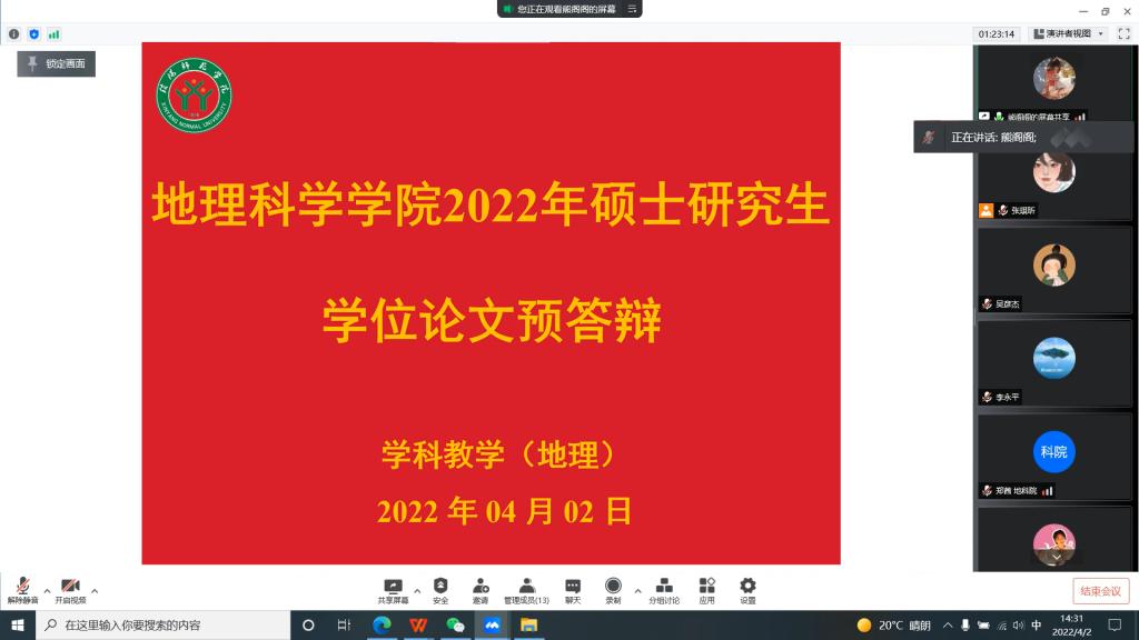4月2日,公司2022届硕士研究生硕士论文预答辩以线上和线下结合的方式,在理科楼北楼1011室、1102教室、软科基地和腾讯会议平台举行。刘明华教授、颜俊博士、张兴国副教授、郜慧副教授、范辉副教授、杨先武副教授莅临会场并担任评委组组长,地理学和学科教学(地理)专业研究生60余人参加了预答辩评审会。
