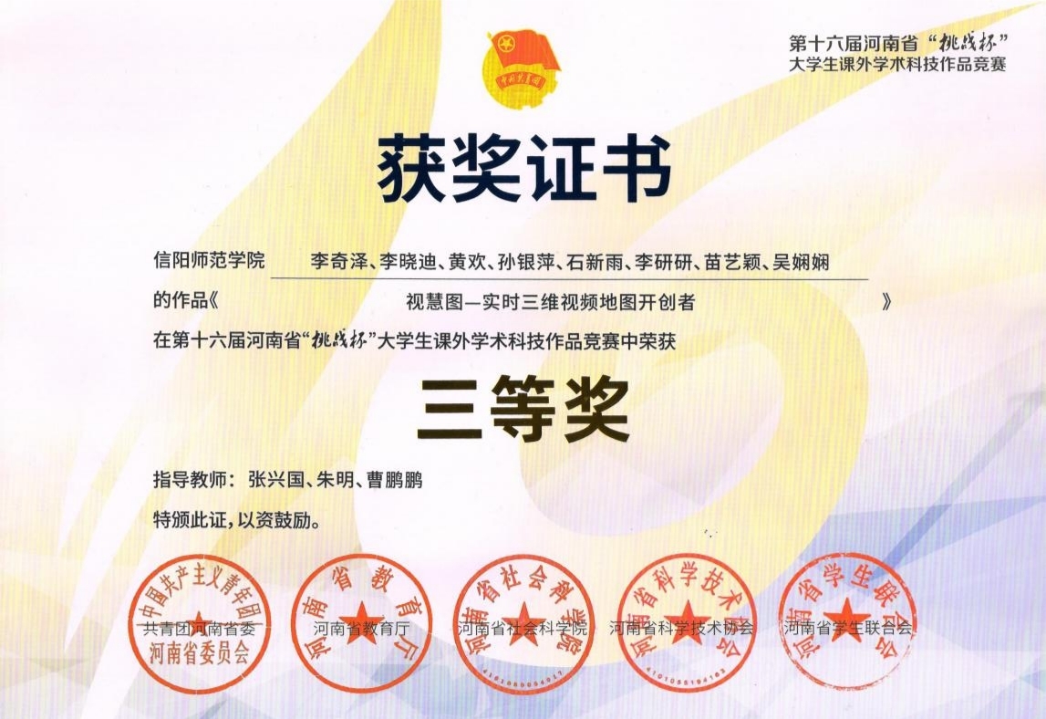 近日,共青团河南省委公布了河南省第十六届“挑战杯”老员工课外学术科技作品竞赛的获奖名单,公司张兴国副教授、朱明博士和曹鹏鹏老师指导,2021级地图学与地理信息系统专业研究生李奇泽等人完成的《视慧图—实时三维视频地图开创者》,从众多作品中脱颖而出,荣获第十六届河南省“挑战杯”老员工课外学术科技作品竞赛三等奖。
