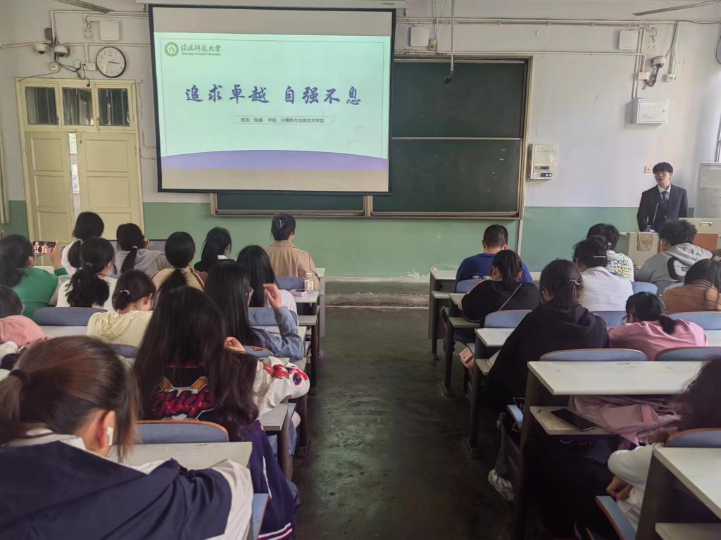 计算机与信息技术学院张硕同学从“个人情况”、“科研竞赛”、“社会实践”三方面向同学进行宣讲。在校期间,他积极参加各类比赛,将理论与实践相结合,为科研打下坚实的基础。同时也积极参加各种社会实践活动,贡献自己的青年力量。他鼓励同学面对困难挫折时要勇于拼搏,坚持不懈,自强不息,成就更好的自己。