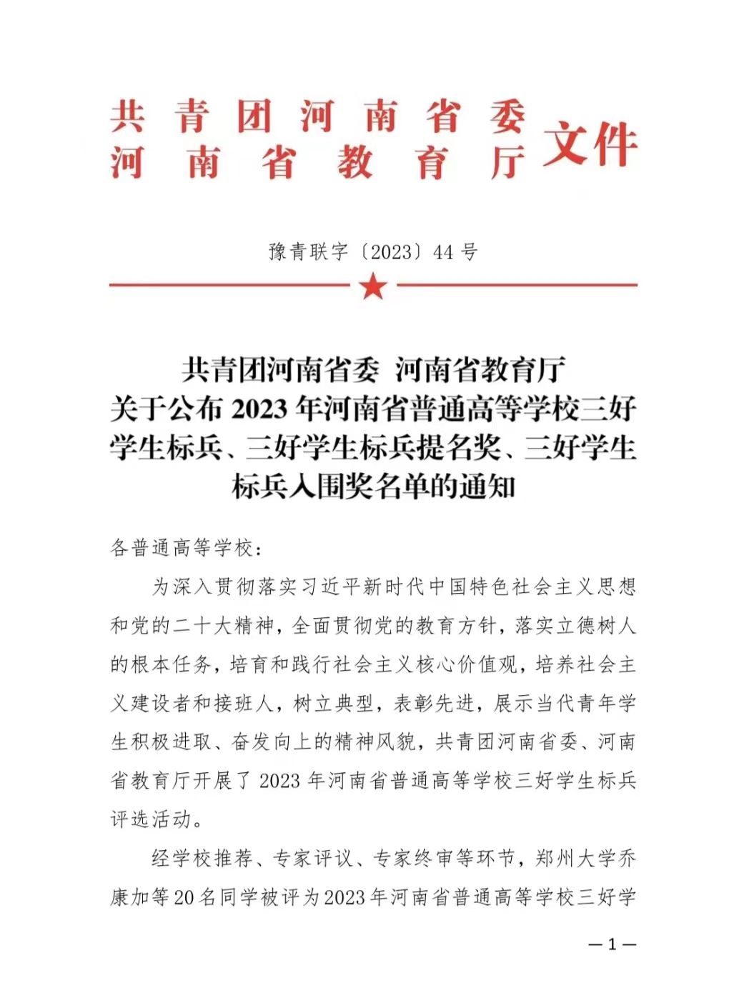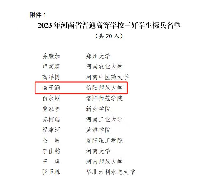 近日,共青团河南省委、河南省教育厅印发《关于公布2023年河南省普通高等学校三好员工标兵、三好员工标兵提名奖、三好员工标兵入围奖名单的通知》,全省共评选出三好员工标兵20人、三好员工标兵提名奖20人、三好员工标兵入围奖20人。公司2020级地理信息科学班高子涵同学荣获“河南省三好员工标兵”荣誉称号。