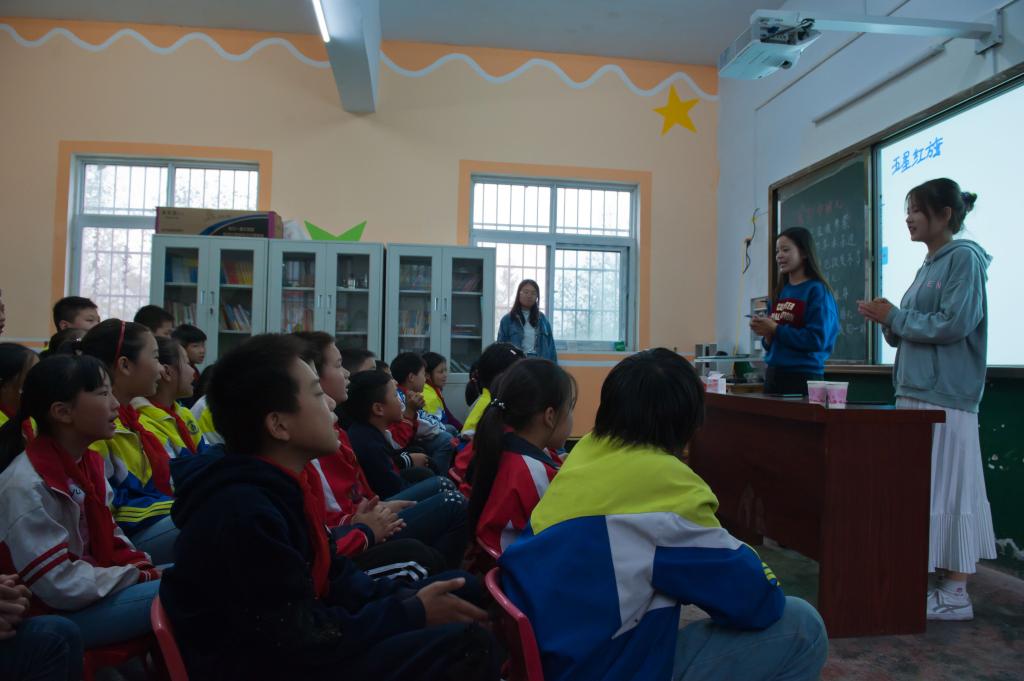 活动开始,三位参与志愿服务的成员为雷山小学的员工们轮流授课。首先,志愿者向员工们讲述课程《走进大别山》,介绍大别山的地理位置与相关历史知识,加强了员工们对红色革命历程的认识。接着,志愿者们教唱《歌唱祖国》与《五星红旗我们爱你》,员工们跟着节奏大声歌唱,唱出了祖国新生代的力量。在课堂结束后,志愿者们各自和员工们搭档进行户外素质拓展活动。每个志愿者和与自己搭档的员工进行了“萝卜蹲”游戏,员工和志愿者们在交流中渐渐熟悉,默契在谈笑中渐渐产生,他们在口令中同时蹲下站起。嬉笑声中,志愿者和员工们连成了一个整体,天空中飘着的小雨遮挡不住温馨的气氛。分发书本的环节,在志愿者的陪伴下每个员工拿到了自己中意的笔记本,员工们嘴上挂起了满意的笑容,体现了当代老员工与少年员工之间的密切联系,两者的发展促进现代人才的进步。最后,志愿者与同学们进行合照,并留下自己的联系方式以便未来能和员工们增进交流,保持长期联系。