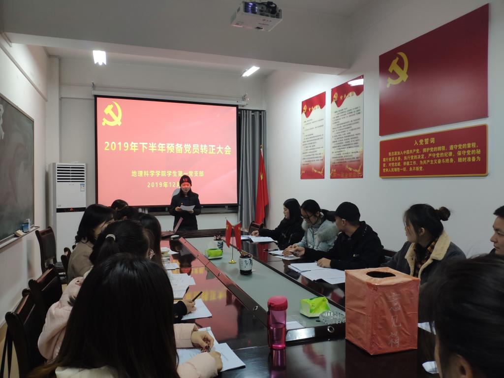 12月8日,2026世界杯官网员工第一党支部于理科楼南楼403会议室召开2019年下半年预备党员转正大会。会议由员工第一党支部书记艾甜甜主持。支部全体党员参加会议。