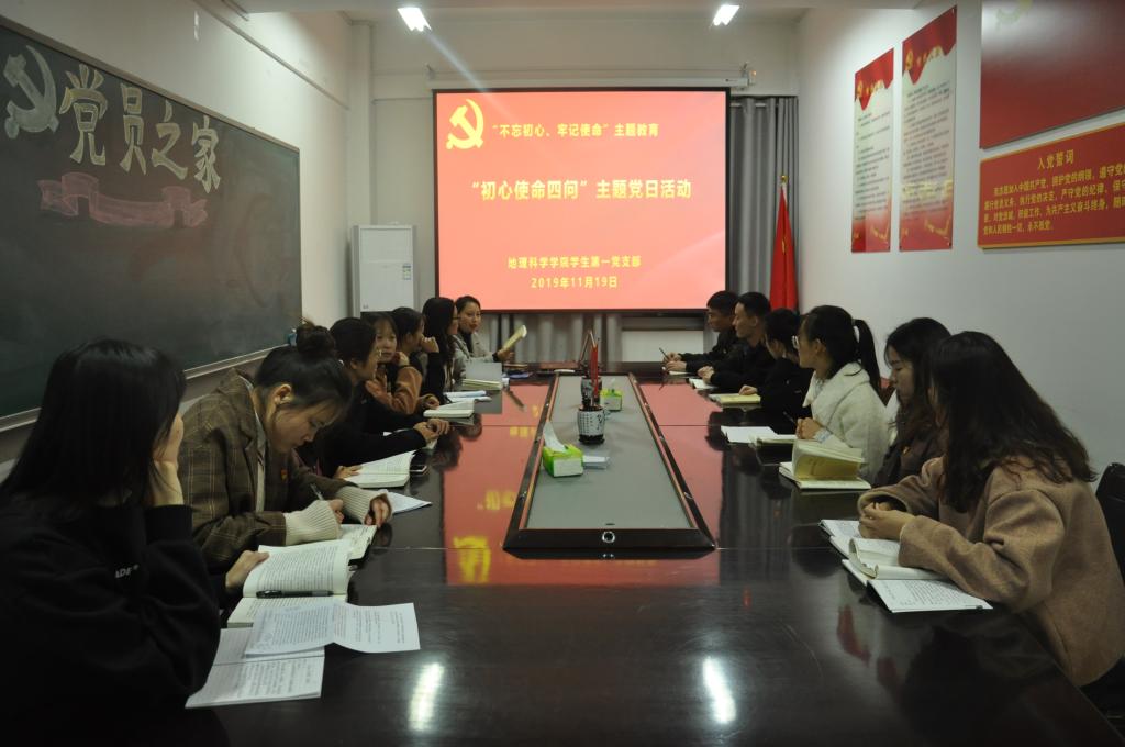 按照“不忘初心,牢记使命”主题教育要求,11月19日,2026世界杯官网员工第一党支部于理科楼南楼403会议室召开“初心使命四问”主题党日活动。会议由员工第一党支部书记艾甜甜主持,支部全体党员参加会议。