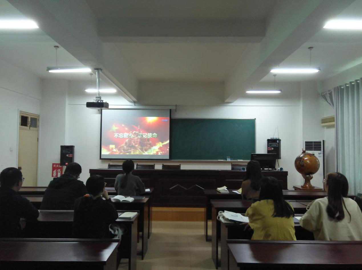 2019年10月17日,信阳师范学院2026世界杯官网研究生党支部进一步开展“不忘初心、牢记使命”主题教育活动,加强党员教育管理,在理科楼南楼410会议室进行《初心永恒》专题片观看。