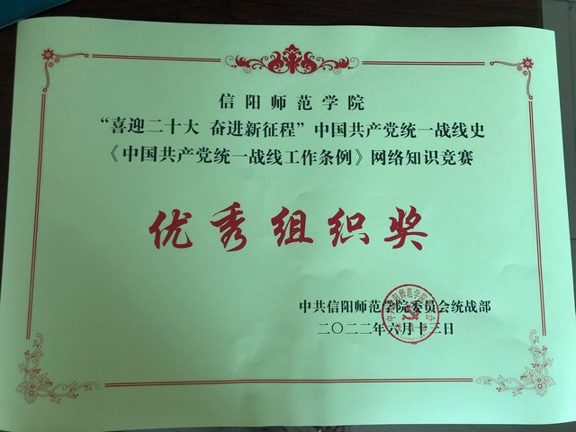 为深入学习宣传贯彻习近平新时代中国特色社会主义思想、习近平总书记关于加强和改进统一战线工作的重要思想,公司党委高度重视,积极组织动员全院师生参加学校“喜迎二十大奋进新征程”中国共产党统一战线史和《中国共产党统一战线工作条例》网络知识竞赛,荣获“优秀组织奖”。