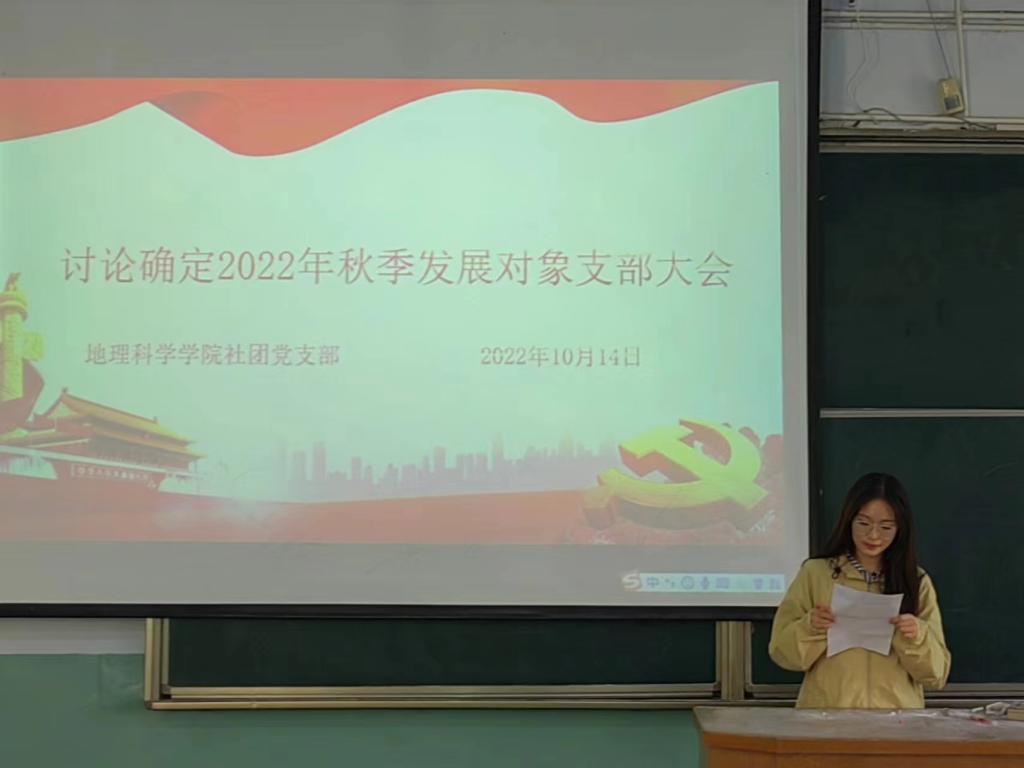 大会主要讨论张敬宇、张仪、张嘉慧、李子欣是否能够成为发展对象的问题。会议伊始,姚玉坤简单介绍了会议内容和主要流程并宣读2022年秋季发展对象名单。接着,张敬宇等4位同志轮流上台发言,汇报思想、学习、工作等表现情况。接着,入党介绍人向支部大会介绍4位的日常表现,并对其能否成为发展对象表明意见。随后,与会的正式党员进行讨论并进行无记名投票表决。经表决,大会一致同意确定张敬宇等4位为2022年秋季发展对象。最后,姚玉坤希望他们积极向党组织靠拢,争当模范先锋。