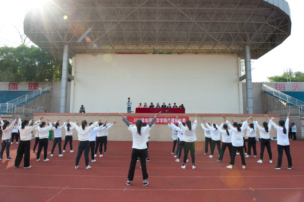 在主持人宣读了比赛流程与评分细则后,比赛正式开始。环境工程与科学班、地理科学一班、地理科学三班、人文地理与城乡规划班、地理信息科学班、测绘工程班、地理科学二班依次踏着整齐划一的步伐进入场地。在广播操音乐的伴奏下,每个班的参赛成员高昂姿态、张弛有度,尽全力去完成自己动作,彰显了地理人的青春活力。其中人文地理与城乡规划班动作规范、美观大方,赢得全场阵阵掌声。最后,人文地理与城乡规划班获得第一名,地理信息科学班获得第二名,地理科学一班第三名。最后,朱浩东进行总结发言,他首先对此次比赛的目的进行诠释,接着指出做一个积极乐观的人的重要性,希望全体同学能强身健体,以健康的体魄去迎接学习上遇到的困难,并向获得名次的班级表示祝贺。