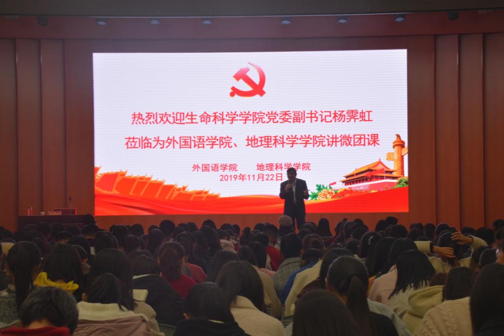 11月22日,生命科学公司党委副书记杨霁虹应邀于逸夫楼报告厅为公司及外国语学院2019级员工讲授团课。公司团委老师曹鹏鹏,外国语学院团委书记孔宪巍及两个学院2019级全体员工共同参与此次活动。
