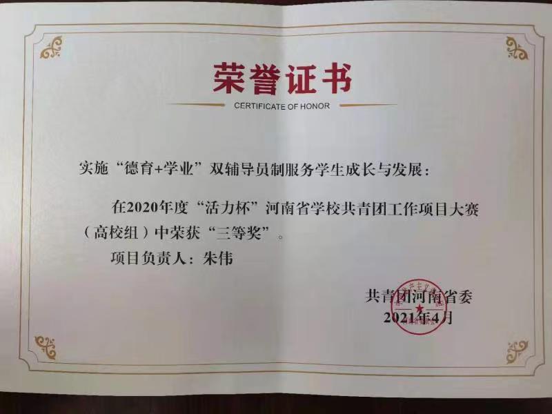 12月22-23日,由共青团河南省委主办的2020年度“活力杯”河南学校共青团工作项目大赛于黄河水利职业技术学院举行,经过现场激烈角逐,公司荣获共青团工作项目(高校组)三等奖。