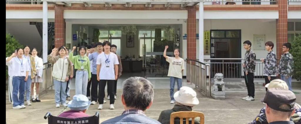 在社团的组织下,啄木鸟心益社的社员们来到了阳光家园老年公寓看望老人。首先,社员们热情又专注地为老人们演唱了《歌唱祖国》和《强军战歌》两首歌曲,又表演了话剧《破晓》。