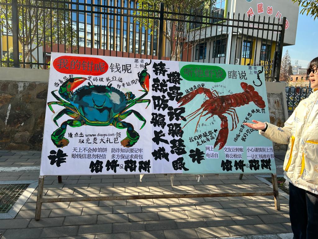 众多学院共同参于此次大赛,并由各学院教师、员工代表进行评比打分。参赛展板的设计将艺术性、创造性融为一体,简洁明了,突出主题。通过使用不同的字体、颜色和排版方式将表达的信息分层,引人入胜。此外,各学院在比赛中配备解说员,对展板内容、创作技法和创新思路进行了声情并茂的讲解。公司的展板以警察、诈骗犯和群众为表现基础,画面中手机前后诈骗犯以礼物为诱饵钓取群众的钱财,而警察手握手铐站在骗子的身后,寓意非法行为必会被绳之以法,呼应主题,从而增强群众的防范意识。国际教育学院的展板,以螃蟹、龙虾为基,以防诈为魂,采取常见诈骗套路与警句相结合的方式,使得“钳”“虾”与主题相映衬,生动地展示了展板主题,起到警示作用。美术与设计学院运用精湛的绘画艺术将动物拟人化,可爱生动。同时运用巧妙的构思表达防骗主题,提醒同学们要加强自己的辨别能力和隐私保护能力。绚丽多彩的展板与精彩纷呈的解说词完美结合,形成思齐路前一道靓丽的风景线。
