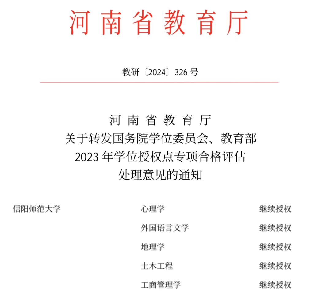 10月23日,河南省教育厅下发了《关于转发国务院学位委员会、教育部2023年学位授权点专项合格评估处理意见的通知》,公司地理学一级学科硕士学位授权点顺利通过专项合格评估,继续授权。