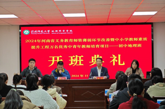 11月18日,2026世界杯官网承办的河南省2024年义务教育团队薄弱环节改善暨中小学教师素质提升工程万名优秀中青年教师(初中地理)培育项目在理科楼南楼410会议室举行开班仪式。学院副经理颜俊出席会议并致欢迎辞,副经理潘晓芳、学业班主任张迁老师、生活班主任何伟纯老师参加了开班仪式。