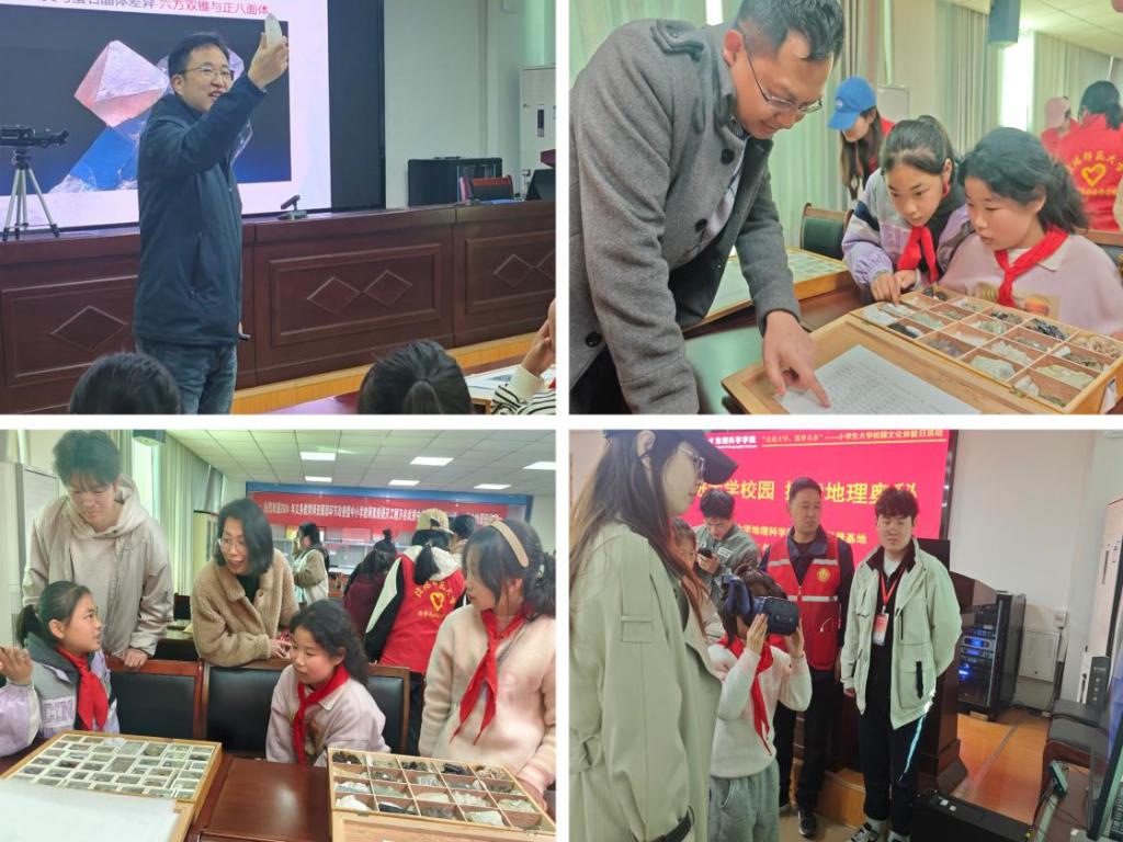 随后,员工们前往理科楼南楼410会议室,听取了史兴俊副教授带来的“会说话的石头”科普讲座。史老师运用生动的语言和丰富的矿石标本,向孩子们介绍了美丽的矿物晶体,并展示了如何通过石头获取信息使石头“开口说话”。在实践环节,员工们通过亲手触摸水晶、石英等矿物标本及古生物化石,分组参与地球仪互动探索、天文望远镜观测和VR地理场景虚拟漫游等趣味项目,不仅沉浸式感受了地质科学的奇妙魅力,更通过多维度的感官体验,直观地领悟了地球科学的生动内涵与探索价值。
