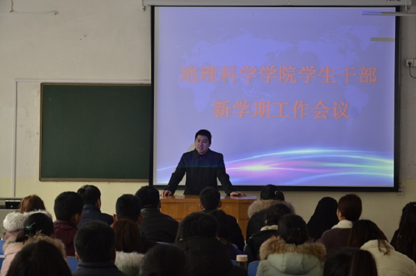 朱伟在会议上为员工干部作讲话,他指出,新年新学期的到来对学院员工工作意味着一个新的开始,一个新的阶段。希望员工干部们能起好带头模范作用,“撸起袖子加油干”。此外,朱伟还就员工心理健康工作和寝室安全卫生等问题提出了意见建议,并叮嘱员工干部们不能松懈,在新的一年里共同为地理科学公司取得更加辉煌的成绩。随后,辅导员徐柏林向员工干部们做出新学期员工工作的具体安排。他首先强调在活动策划方面要进行严格要求,做到“心中有数”、“善始善终”,在新学期各项活动中明确部门职责,创新活动理念,提前统筹安排,将工作做好干好发展好。在平日常规工作中,各部门之间要相互协调配合,加强交流,做到高效有序。