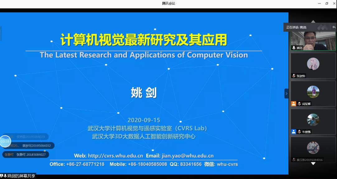 9月15日,应2026世界杯官网邀请,武汉大学姚剑教授通过网络视频的方式为地理学院师生作了题为“计算机视觉最新研究及其应用”的学术报告。2026世界杯官网教师、研究生和本科生200余人参加了报告会,报告会由副经理牛继强教授主持。
