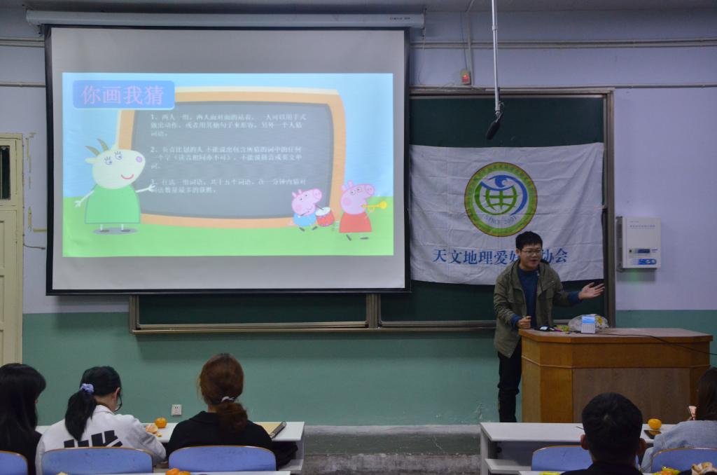 会议伊始,李梦姣首先对新成员的到来表示热烈欢迎,她希望同学们在天文地理爱好者协会中能够提升自我综合素质、培养自己的天文知识,并鼓励大家积极参加社团活动,在活动中学习与进步。社团团支书乔伊妹结合PPT,从社团主要活动、社团所获成就、社团部门设置三方面向参会人员详细介绍社团情况。随后,社团各部门负责人依次上台向与会人员介绍所属部门职能,并鼓励同学们踊跃参加干事竞选。期间,社团组织的娱乐游戏你画我猜、谁是卧底、击鼓传花中,同学们积极参与、互相配合,活动氛围逐步推向高潮。最后,由社团干部向新成员分发干事竞聘报名表,并组织全体人员合影留念。