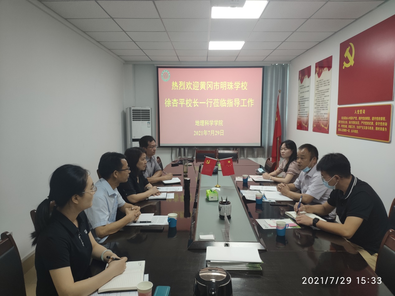 2021年7月29日,黄冈市明珠学校徐杏平副董事长和卢哲老师来公司访问交流,并对硕士毕业生孟苗苗进行考察。公司党委书记宋力、地理科学系主任颜俊、研究生工作秘书闫军辉和班主任郑茜参与座谈。会议由党委书记宋力主持。