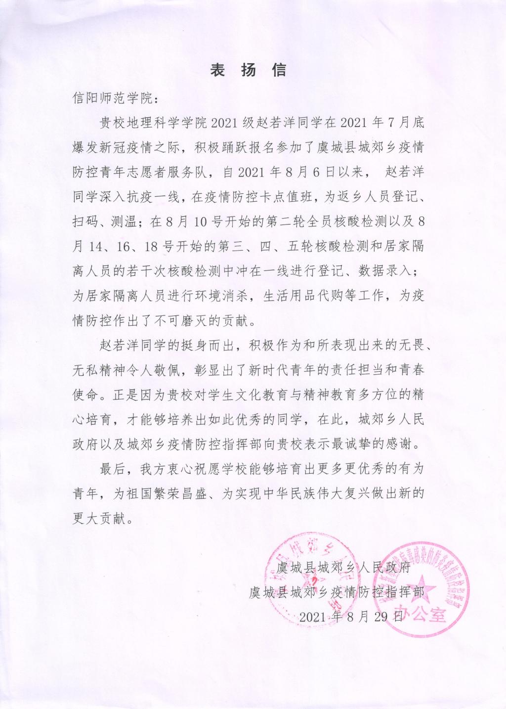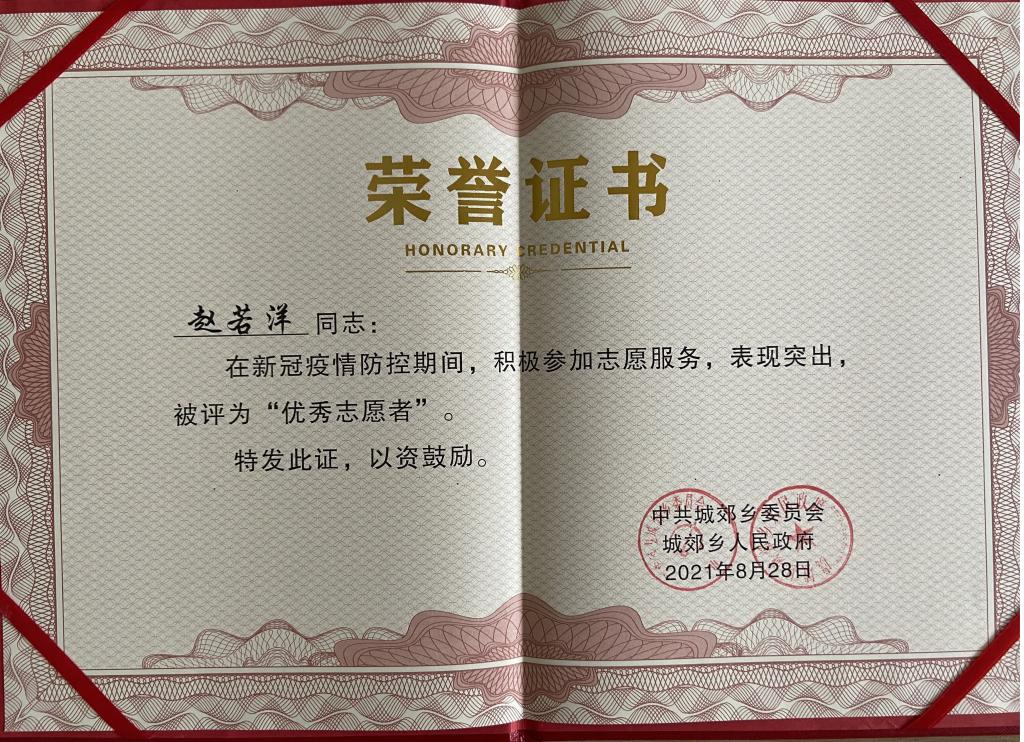 自2021年8月6日以来,赵若洋同学不畏艰险,奋战在抗疫一线,在疫情防控卡点值班,为返乡人员登记、扫码、测温;在8月10号开始的第二轮全员核酸检测以及8月14、16、18号开始的第三、四、五轮核酸检测和居家隔离人员的若干次核酸检测中,冲在一线进行登记、数据录入;为居家隔离人员进行环境消杀,生活用品代购等工作,守护人民群众身体健康和生命安全,为当地疫情防控作出了重要贡献。中共城郊乡委员会和郊乡人民政府对在疫情防控工作中表现突出的赵若洋同学颁发“优秀志愿者”荣誉证书,并向信阳师范学院寄表扬信。