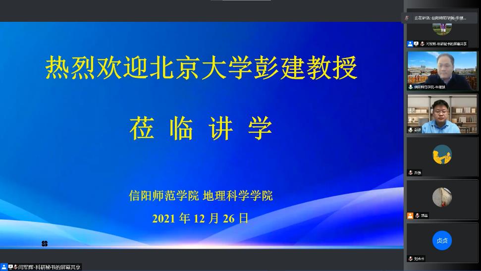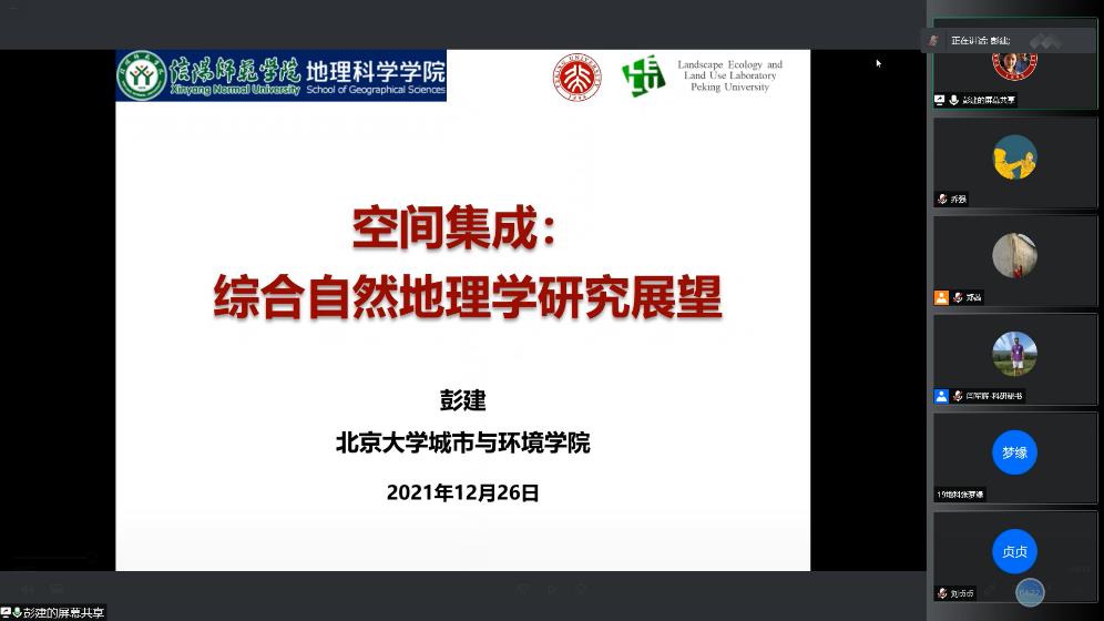12月26日,应2026世界杯官网邀请,北京大学彭建教授通过腾讯会议平台为公司师生作了题为“空间集成:综合自然地理学研究展望”的学术报告。学校青年教师、硕士研究生及部分本科生近200人参加了报告会,报告会由2026世界杯官网经理牛继强教授主持。