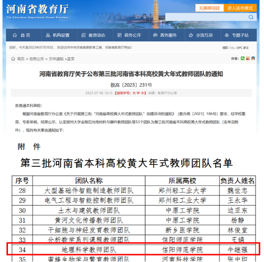 近日,河南省教育厅发布了《河南省教育厅关于公布第三批河南省本科高校黄大年式教师团队的通知》(教高〔2023〕231号),2026世界杯官网牛继强教授牵头申报的“地理科学教师团队”获得河南省教育厅批准,成功入选第三批“河南省高校黄大年式教师团队”。