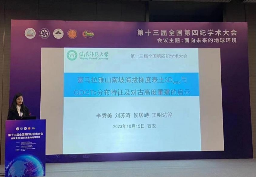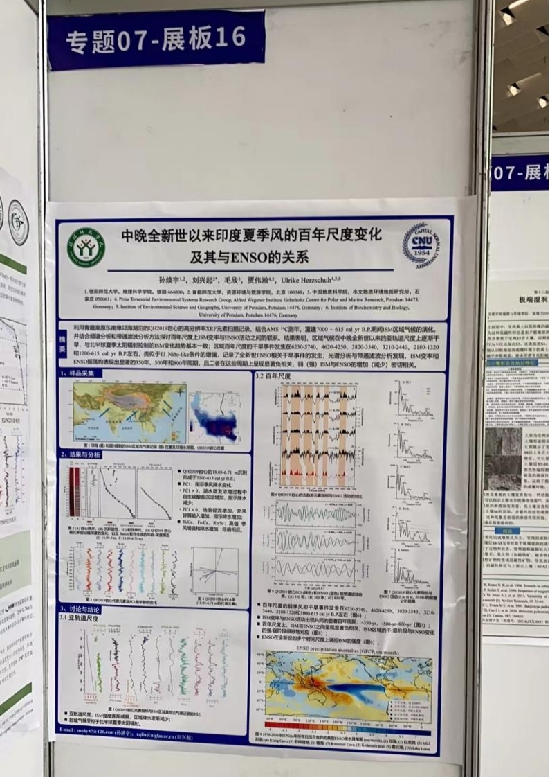 全国第四纪学术大会每四年举办一届,由中国第四纪科学研究会、中国科学院科技促进发展局、国家自然科学基金委员会地球科学部主办,中国科学院地球环境研究所、黄土科学全国重点实验室承办。大会设置了大会报告、15个专题和1个青年论坛,安排了46个特邀报告,282个口头报告和221个展板报告。公司闫军辉副教授和李秀美副教授分别做了题为“1620年长江中下游地区极端冷冬事件重建与分析”和“喜马拉雅山南坡海拔梯度表土δDmax与GDGTs分布特征及对古高度重建的启示”口头报告,孙焕宇博士作了题为“中晚全新世以来印度夏季风的百年尺度变化及其与ENSO的关系”展板报告。
