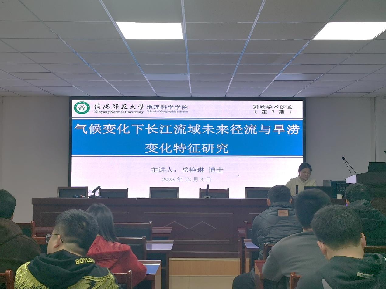 12月4日,公司于理科楼南楼410会议室举行第7期贤岭学术沙龙,岳艳琳博士应邀作了题为“气候变化下长江流域未来径流与旱涝变化特征研究”的学术报告,公司青年教师和硕士研究生70余人参加了报告会,会议由研究生班主任何伟纯博士主持。