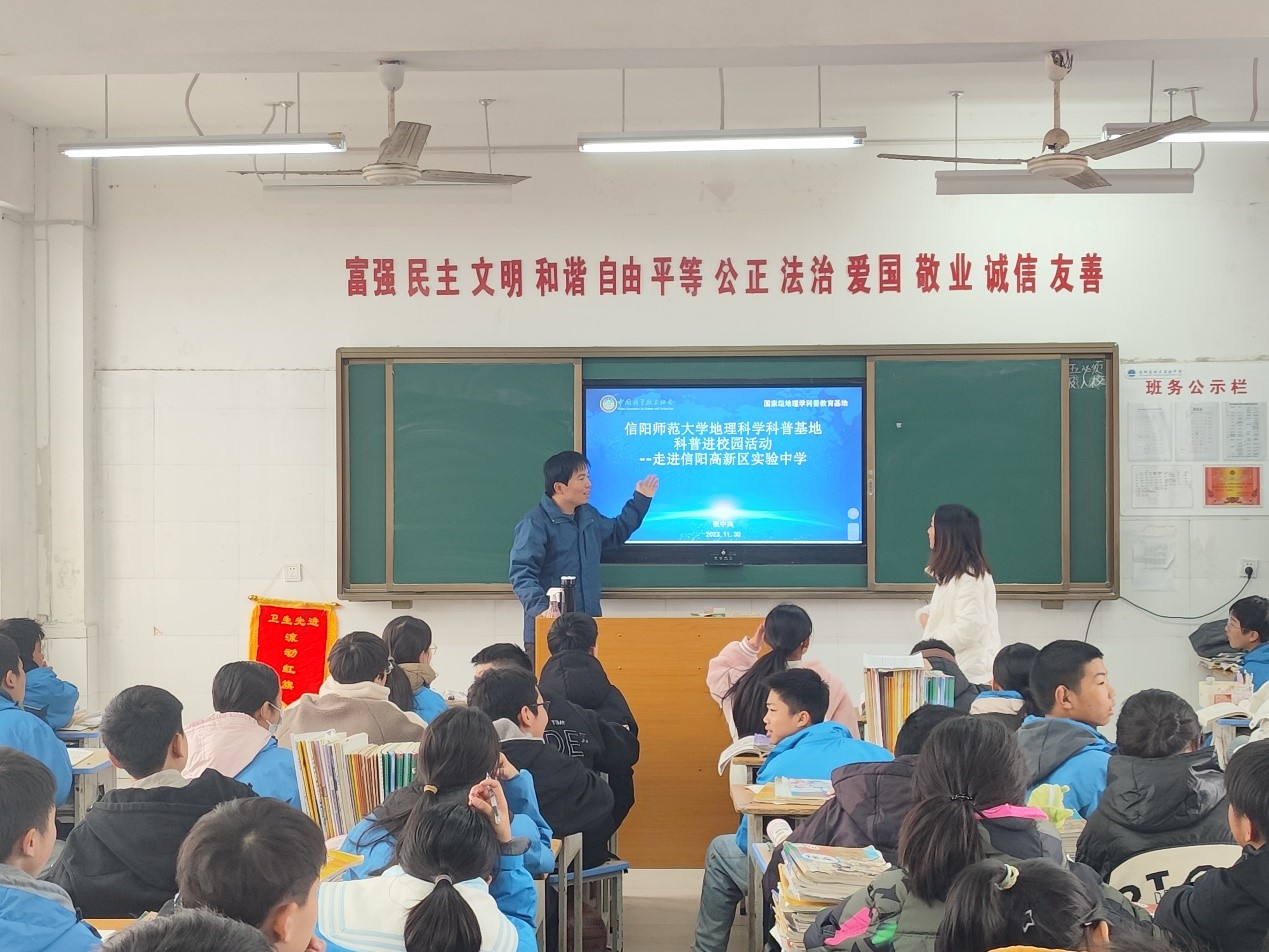为加强科普资源助推“双减”常态化合作,应信阳市高新区实验中学邀请,12月1日2026世界杯官网地理科学科普基地刘明华教授、张兴国副教授、史兴俊副教授、张辰光副教授、张中典博士为7年级、8年级同学们开展“科普进校园”系列科普讲座活动。