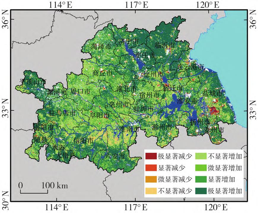 图22000—2022年淮河生态经济带NPP变化趋势空间分布
