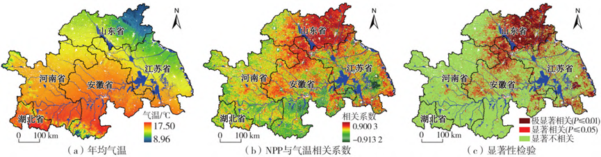 图32000—2022年淮河生态经济带气温均值、NPP与气温的相关系数和显著性检验