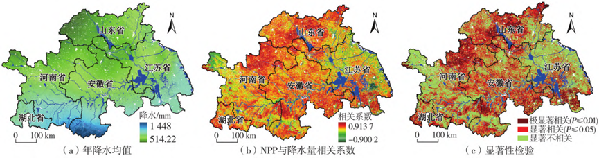 图42000—2022年淮河生态经济带年降水均值、NPP与降水的相关系数和显著性检验