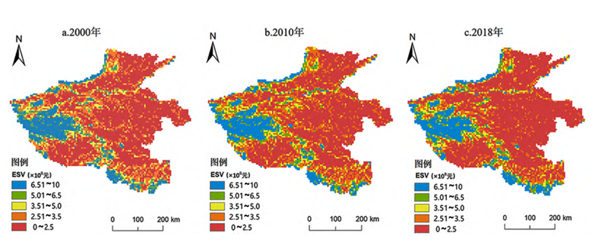 首先,研究者通过将河南省各地类的ESV值变化进行研究比较发现,河南省在2000-2018年期间土地利用/覆被(LUCC)变化显著,总体趋势表现为林地、水域、建设用地面积增加,耕地、草地、未利用土地面积减少,未利用土地变化幅度最大。而总ESV则呈先增多后减少的变化趋势。其中,林地、水域的ESV均呈增加趋势,耕地、草地、未利用土地的ESV则均呈减少趋势。各单项生态服务价值从大到小依次为:保持土壤>维持生物多样性>水文调节>废物处理>气候调节>气体调节>原材料生产>食物生产>提供美学景观,一定程度上反映了河南作为粮食大省,土地的贡献能力。