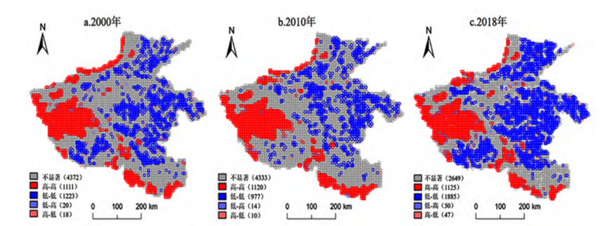 除此之外,研究者发现河南省ESV还存在显著的空间依赖性。由观察分析得出高集聚区集中分布在豫西大部分地区、豫南部分地区以及豫北沿省界呈条带状分布地区,低-低集聚区则广泛在豫中、豫东及豫北大部分地区;而在不同时段河南省ESV的LISA(本地化国际标准组织)集聚图也存在明显差异,2000-2018年,高-高集聚区数量较为稳定,但低-低集聚区数量变幅较大。