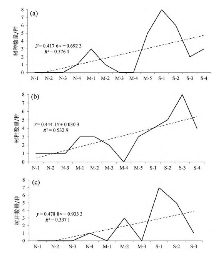 图2.秦巴山地东部(a),中部(b),西部(c)样线常绿阔叶林树种树的南北向变化
