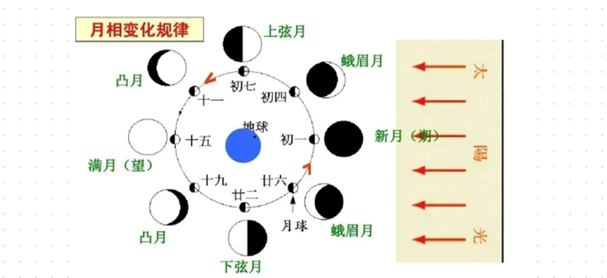 此外,月相变化还受到地球自转的影响。地球自转使得地球上的人们在不同时间看到月球的不同亮面。例如,当我国看到满月时,地球另一侧的人们则看到新月。