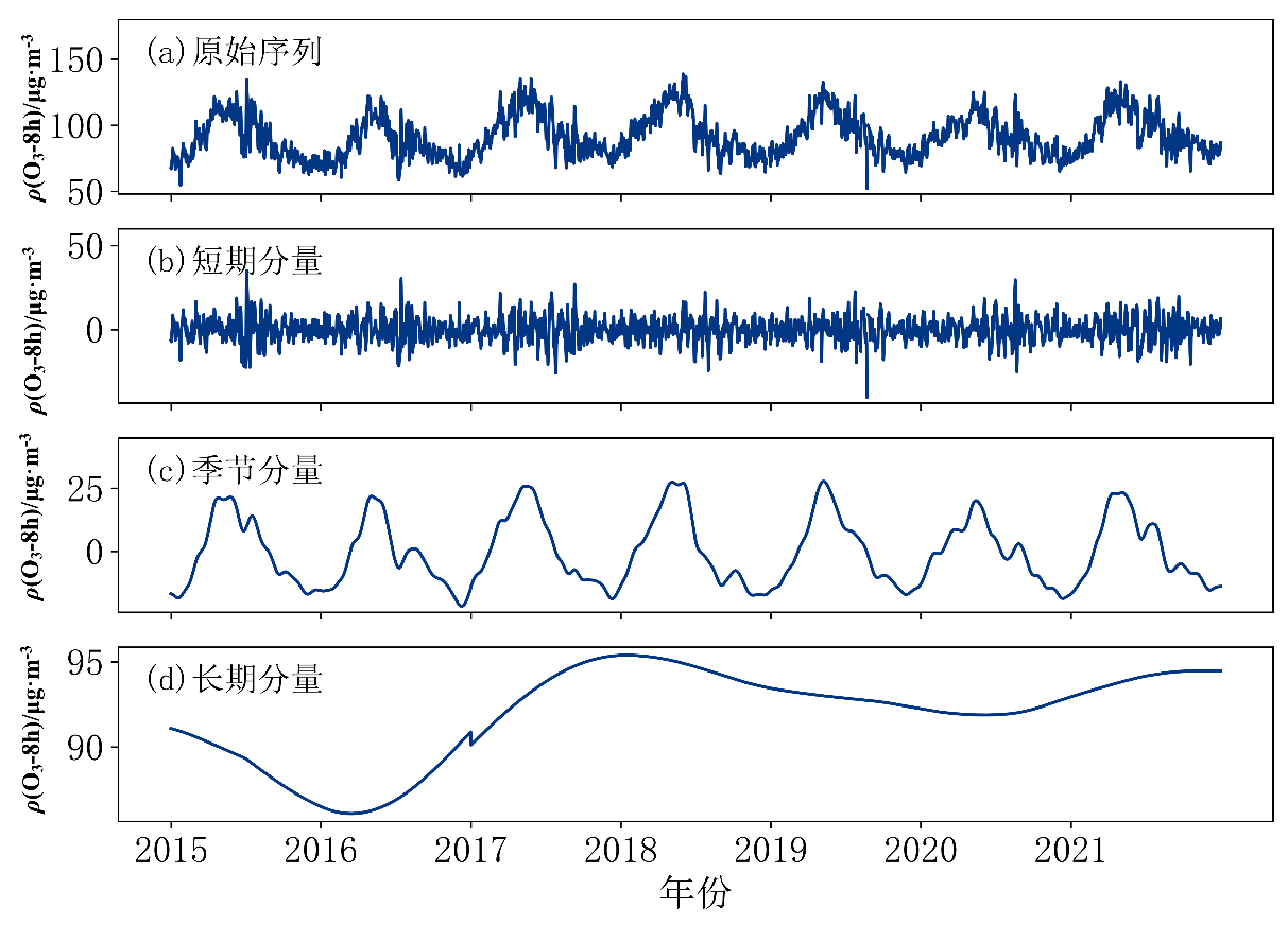 除此之外,研究者对青藏高原地表臭氧浓度时间序列分解,分为短期、季节和长期,并在研究后发现,O₃-8h短期分量的范围为−39.9-35.1μg·m-3,其高频变化主要归因于短期和天气尺度的气象过程;而O₃-8h季节分量有明显的不规则季节循环,可能是排放和气象造成;在过滤短期和季节分量后,发现O₃-8h长期分量呈下降-上升-下降-上升的变化特征,且2018年以前变幅较大,此后变幅较小。